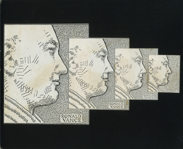 Driving Away From Ronald Vance, 1981, is a xerox work that George Deem reproduced in quantity for Mail Art correspondence (18 xerox copies extant in the George Deem archive). He arrived at the xerox work from a drawing (Study 1) and from this collaged xerox(Study 2)titled "Driving away from Ronald Vance."