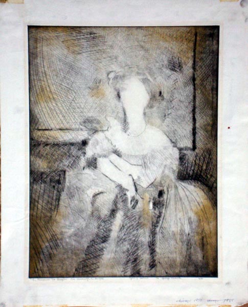 Signed lower center / titled lower left / to George Monk 3/5 (all in pencil /) and "Chicago1958" in ink cancelled with a draw-through line.