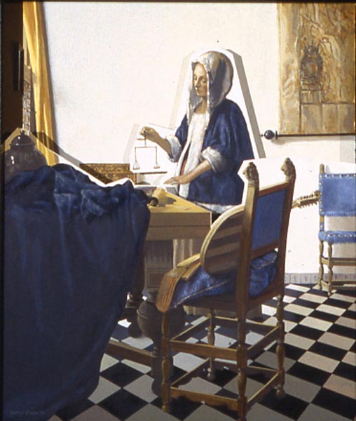 I am very much involved with Vermeer these days, a series of paintings in which I de-construct paintings by Vermeer. I depict his interiors with their familiar furniture and windows but I have taken away his figures. These paintings come from Moving Vermeer where I first took away Vermeer's figures to make the background. It was after painting the background that I got the idea for Vermeer's Chair. The enclosed postcard shows the image, the same image in the back panel of Moving Vermeer. (George Deem, letter to Garland and Suzanne Marshall, May 11, 1998).