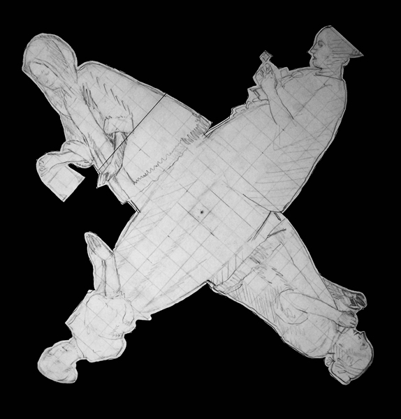 The painting was completed in 1994. The supporting frame and "dialing" wheel were completed in 1996. The medium used was oil paint on shellacked foam core. There are three foam core panels recessed behind a masonite frame, painted black, which has been attached to a Medium Density Fiberboard (MDF) support. Panel No. 1: the background panel. Panel No. 2: the middle moving section has four Vermeer figures of women painted on a four-pronged star-shaped foam core panel attached by a screw to a wooden spindle which in turn is attached to an MDF wheel. Panel No. 3: the foreground panel.
