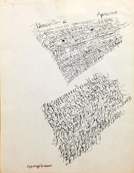 A year later Erma Mae died. She had been taken to many different doctors and mental hospitals during her life, but the latest had been, naturally, Indianapolis. If you are serious enough about illness in Indiana, you finally go to Indianapolis. Erma Mae's doctor was Dr. Miracle. He was giving her electric shock treatments and she died one day coming out of shock. I never knew why she had been given shock treatments because she had nothing to be shocked into nor out of. I received many letters from Erma Mae and she could not write a straight line, but tended to go up at the right of the paper. One of her last letters had such a powerful series of lines that were diagonal that half the paper was not used. The last line said, “it looks like I’m running out of room.” I’ve done three or four paintings like Erma Mae’s letters. When I first met May Wilson I was frightened her name was spelled Mae and thought she could be like Erma Mae.