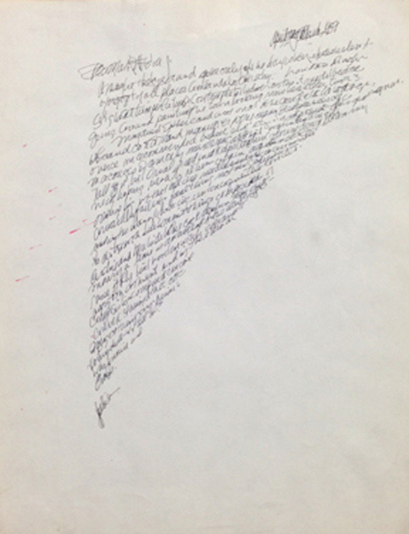 A year later Erma Mae died. She had been taken to many different doctors and mental hospitals during her life, but the latest had been, naturally, Indianapolis. If you are serious enough about illness in Indiana, you finally go to Indianapolis. Erma Mae's doctor was Dr. Miracle. He was giving her electric shock treatments and she died one day coming out of shock. I never knew why she had been given shock treatments because she had nothing to be shocked into nor out of. I received many letters from Erma Mae and she could not write a straight line, but tended to go up at the right of the paper. One of her last letters had such a powerful series of lines that were diagonal that half the paper was not used. The last line said, “it looks like I’m running out of room.” I’ve done three or four paintings like Erma Mae’s letters. When I first met May Wilson I was frightened her name was spelled Mae and thought she could be like Erma Mae.